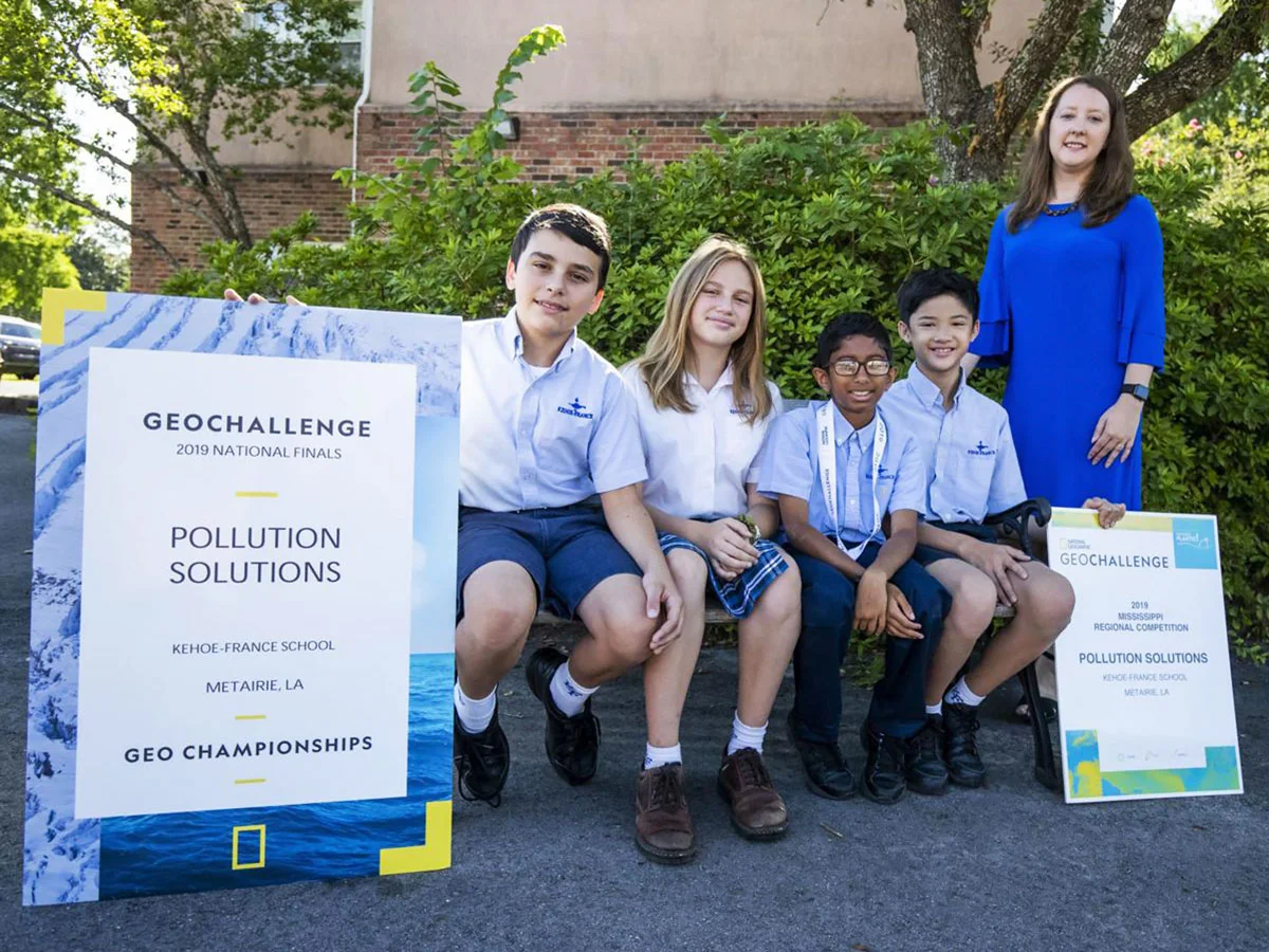 As published in The Advocate on June 7, 2019.When four Kehoe-France School students embarked last fall on a class project focused on plastic pollution, they never expected that it would one day earn them a free trip to the National Geographic Society headquarters in Washington, D.C., to share their discoveries with some of the brightest minds in science.But sure enough, in late May, soon-to-be seventh-graders Duc Hoang, Rishab Prabhu, Nick Rezza and Ginny Robinson traveled to the nation’s capital for National Geographic’s annual GeoChallenge and presented their thoughtful plan to eliminate plastic pollution from Earth’s waterways.The students, known as Team Pollution Solutions, joined 15 teams of young environmentalists from around the country, competing for a chance to win $25,000 and support from National Geographic staff and explorers.This year’s GeoChallenge theme, Tackling Plastic!, aligns with National Geographic’s Planet or Plastic? initiative – a global commitment to reduce the amount of single-use plastic that reaches the oceans by raising awareness, advancing innovation and education and inspiring action.Kehoe-France School’s involvement began with a flyer that was passed along to Alicia Ward, the school’s technology director and middle school design teacher.“I just thought: ‘Well, this will be a really good project,’ not realizing it would go as far as it did,” Ward said.Her students first examined a specific geographic area afflicted with plastic pollution, and then began developing ideas to fix the problem that’s causing it.Pollutions Solutions chose the Yangtze River in China and created a plan for a mesh dam that captures drifting plastic, which then can be removed and recycled.Rishab said his team worked on the project two to three times a week, during their hour-long design class. They used pliable, Crayola Model Magic materials to construct a model of the dam’s foundation, and clever objects to set the scene.“We used fake people to show us constructing the dam, and we used rocks and grass to show the land area around the dam,” said Rishab, noting that he and his teammates also designed presentation slides and practiced showcasing their solution before an audience.Ward served as the coach of five Kehoe-France teams that advanced to the regionals portion of the GeoChallenge. Pollution Solutions earned a spot in the national competition.The first day of the national GeoChallenge was Monday, May 20, and it included interactive workshops meant to help the participants prepare for their presentations and evaluations on the following day.“We learned new techniques to make our project better and ways to improve it,” Nick said. “We learned about mapping, scaling, social media, photo and video tips, and public speaking. Then we had time to improve our projects.”During the semifinals, Pollution Solutions presented their plan to a panel of discerning National Geographic judges.“We had worked very hard and practiced many times on our presentation,” Rishab said. “We were very confident in our project and thought we would definitely win.”Pollution Solutions, however, wasn't one of three teams chosen to advance to the finals, but members were still able to benefit from the experience, both academically and beyond.“I was really impressed with how well they took the news of not making the top three. (The trip) became a little vacation for them,” Ward said. “They told me: ‘We're OK with it, because now the pressure's off and we can just relax.’”Since all of the students participating in the GeoChallenge were divided into teams called pods, they were able to develop friendships with like-minded kids from coast to coast.“With our pods, we went to the (Smithsonian’s) National Zoo, saw the White House, went to many of the memorials and the Natural History and American History museums,” said Nick. “Every night, we had dinner together and had a fun time. We had a game night, a fun dinner at the zoo and a gala.”Rishab said he took selfies with National Geographic officials.“The vice president of NatGeo put his brooch on my coat and asked me to come back next year,” he said. “I would definitely want to try again next year.